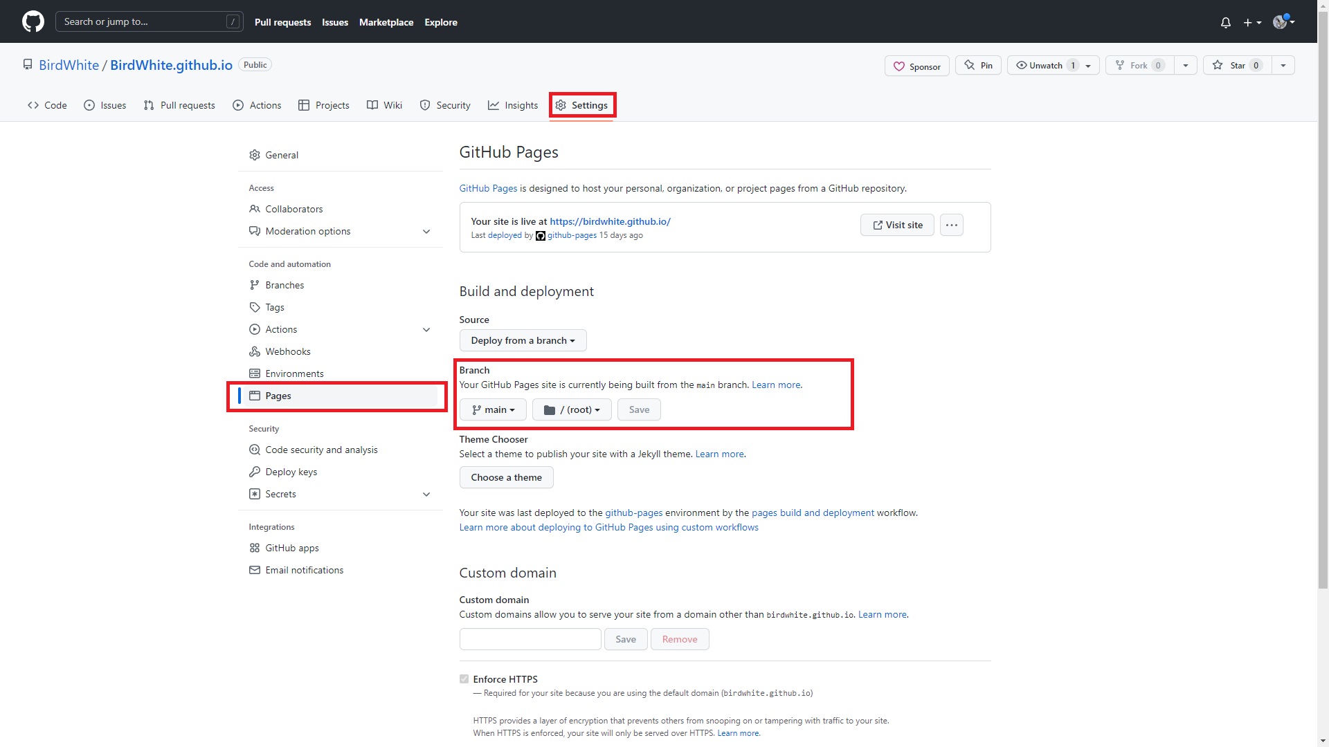 그렇게 만든 리포지터리의 설정에서 Pages의 브랜치를 main에 root로 바꾸고 세이브를하고 5분정도 기다리면 상단에